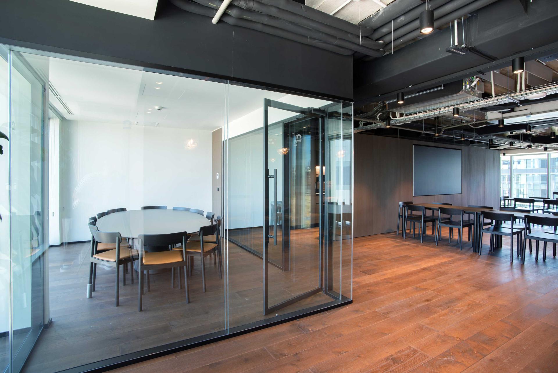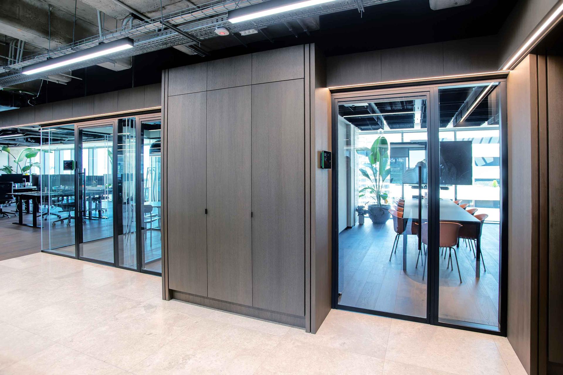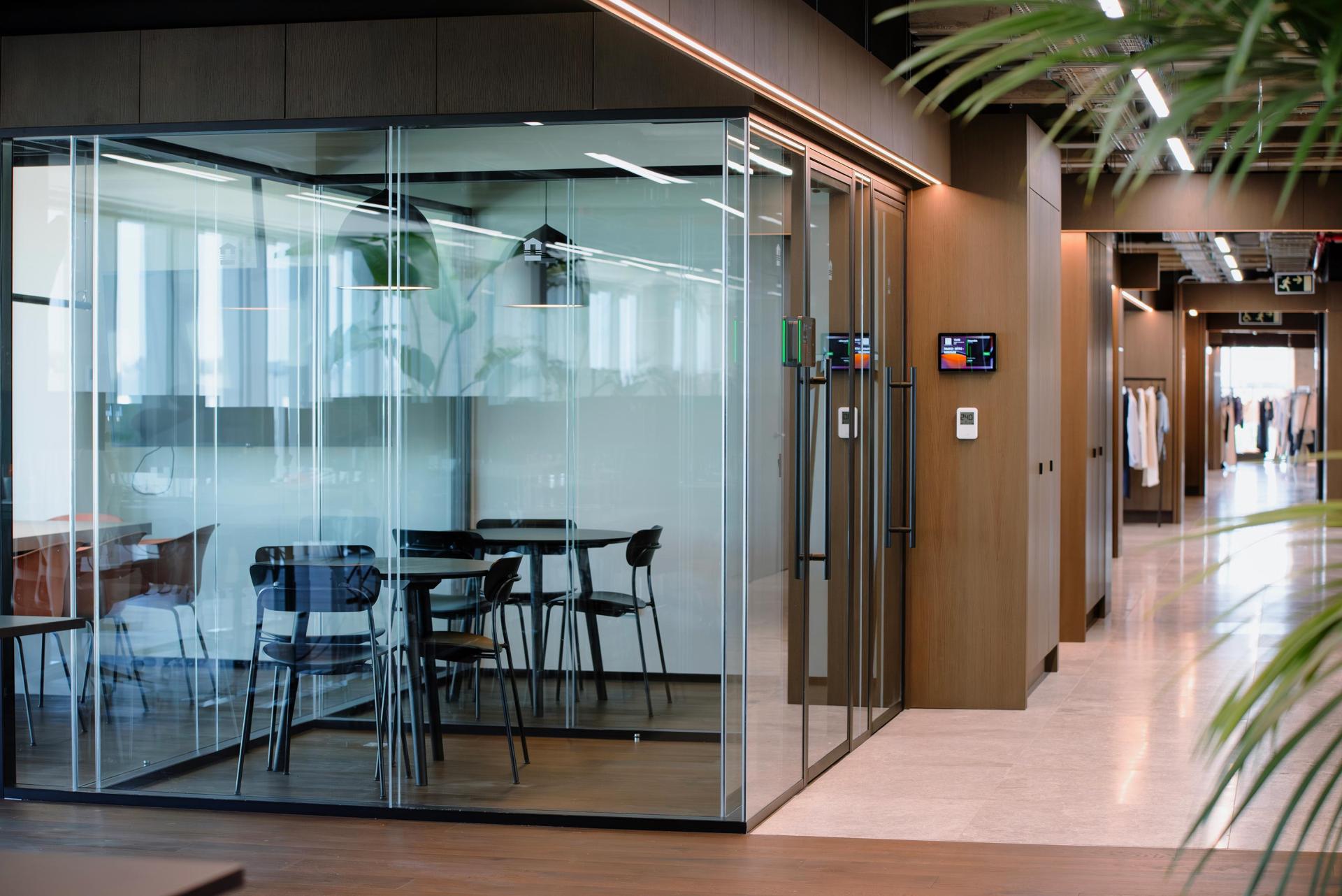 La transparencia de los sistemas permite maximizar la entrada de luz natural, mientras que las prestaciones técnicas garantizan el confort acústico en los distintos espacios de trabajo, reunión y concentración. La resolución de encuentros y la mínima expresión de la perfilería refuerzan la coherencia material con la arquitectura.